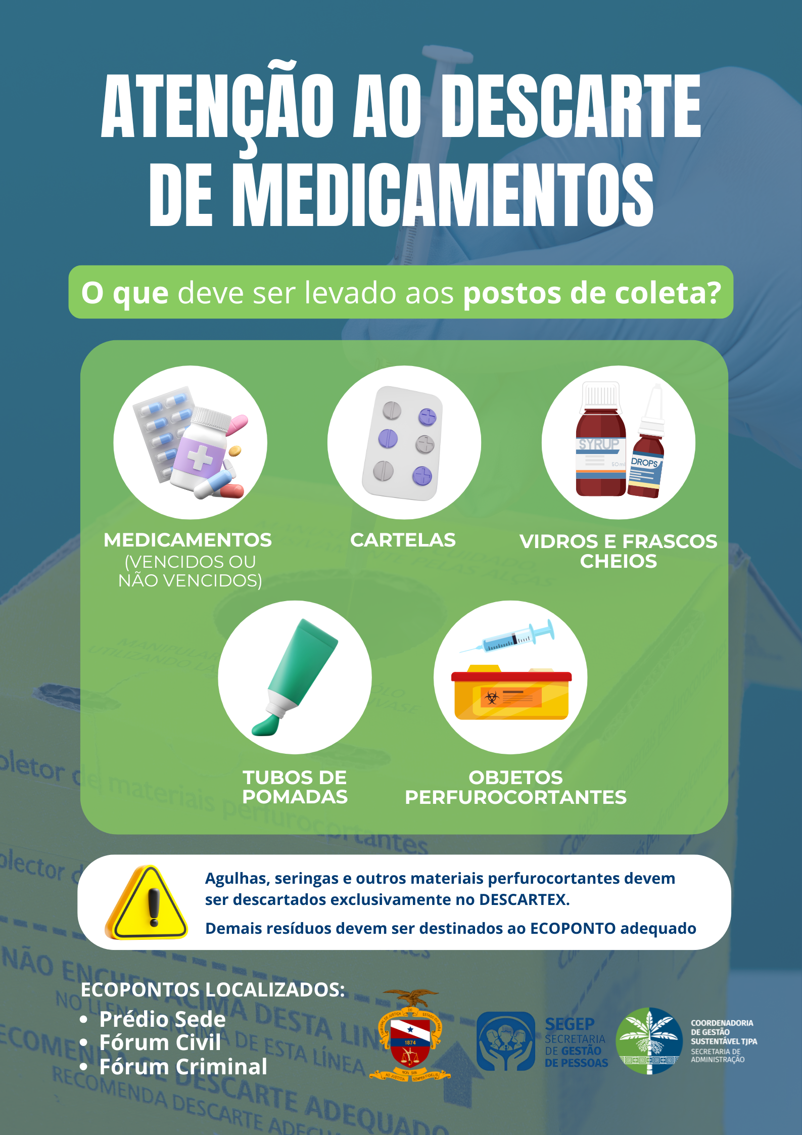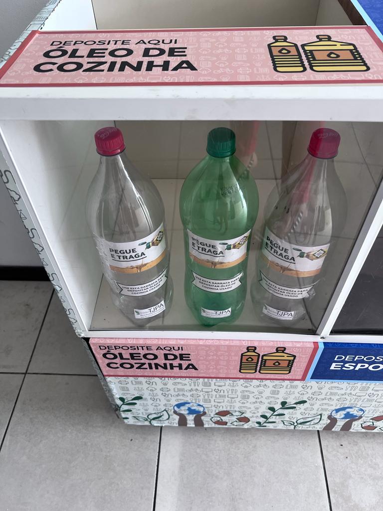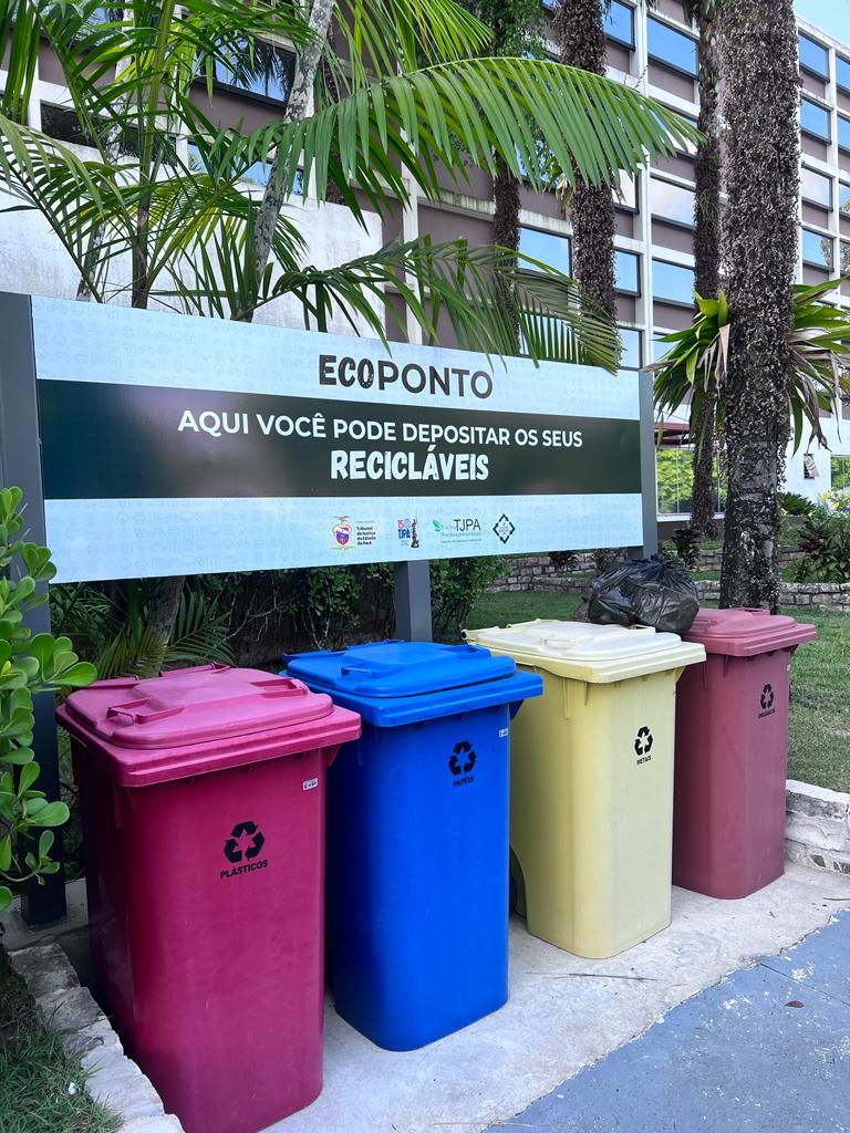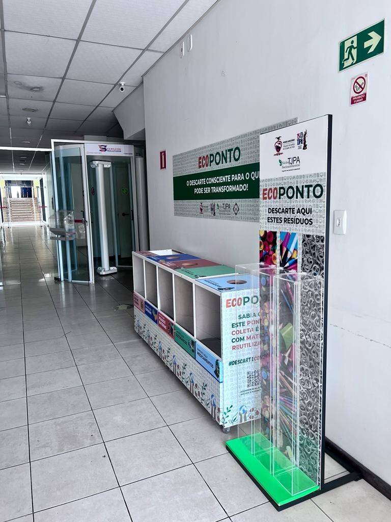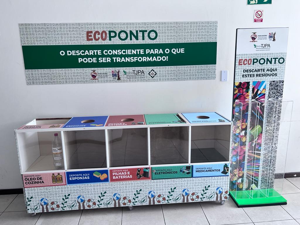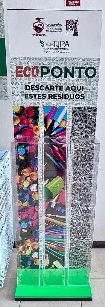 O ecoponto abaixo está situado na entrada do Edifício Sede do Poder Judiciário do Estado do Pará para o descarte consciente e permanente de resíduos perigosos e/ou de difícil reciclabilidade: óleo vegetal, esponjas, pilhas e baterias, eletrônicos, medicamentos, tampas plásticas, instrumentos de escrita e lacres de alumínio. Todos os materiais são triados e destinados a empresas parceiras que efetivam a logística reversa.